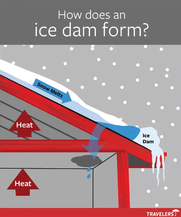 You have ice dams on your home that can damage the roof and cause water leaks inside, damaging ceilings, walls, floors and create potential indoor air quality issues. Ice dams generally form when a large snowfall is followed by several days with temperatures below freezing. When the warm air from your home seeps into the attic, it rises up and heats the higher section of the roof. The snow on the top of the roof melts and the water drains down the roof to the cold overhang, where it freezes. This cycle over several days creates an ice dam, which grows every time is snows.